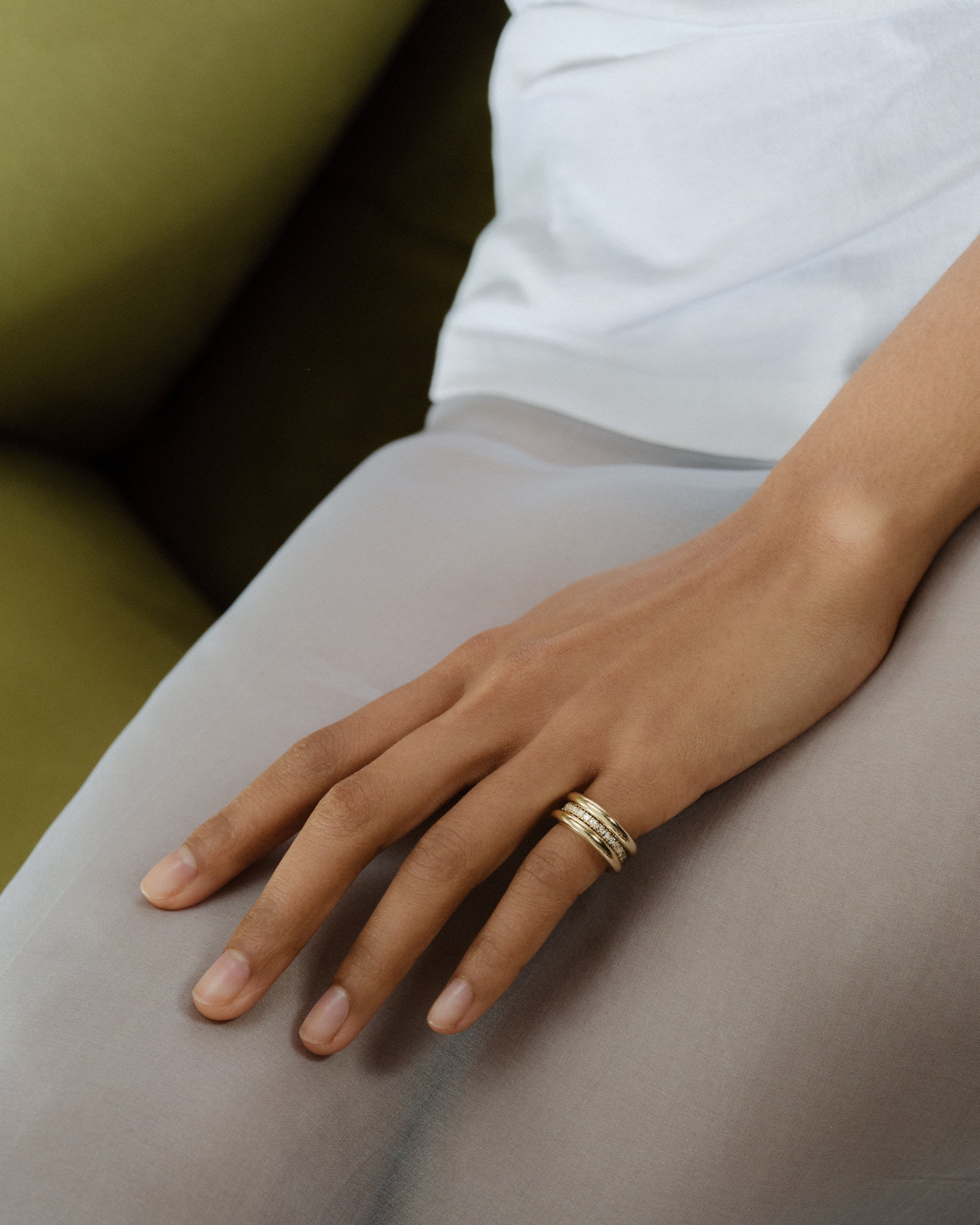 A solid 14K gold band lends that perfect hint of luxe, while a delicate diamond-studded piece adds just the right touch of sparkle. Paired with a hand-carved gemstone ring, this stack is as unique as the one who wears it, each piece designed to be cherished and worn with everything, season after season.